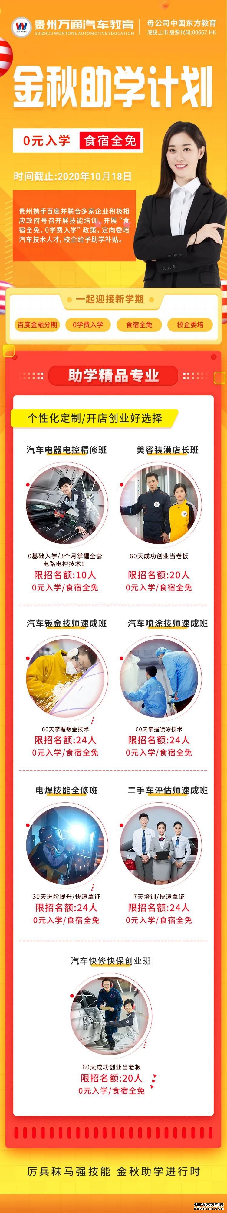 为了更好的帮助适龄青年改变现状,实现快速创业就业的梦想,现贵州携手百度并联合多家企业积极相应政府号召开展技能培训,开展“食宿全免,0学费入学”政策,定向委培汽车技术人才,校企给予助学补贴,具体政策如下:
